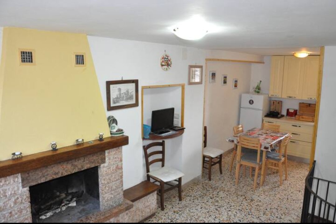 Piano terra: zona giorno con camino, cucina abitabile fornita di tutto il necessario (forno, microonde, tostapane, bollitore, stoviglie, acqua potabile, beni di prima necessità)