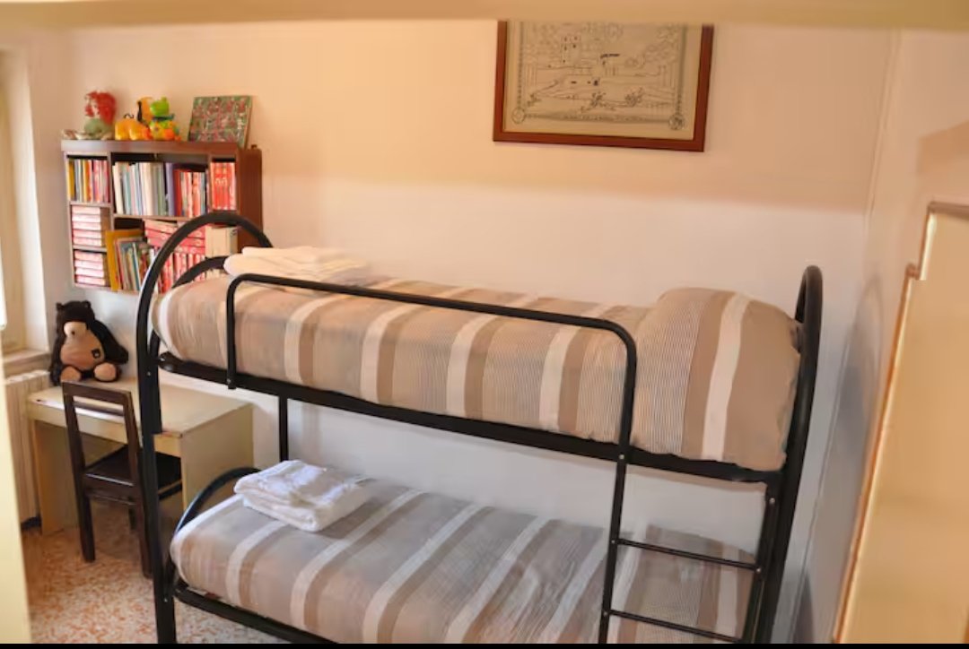 Piano superiore: camera matrimoniale con topper e camera con letto a castello con internamente bagno di servizio (wc e lavandino)